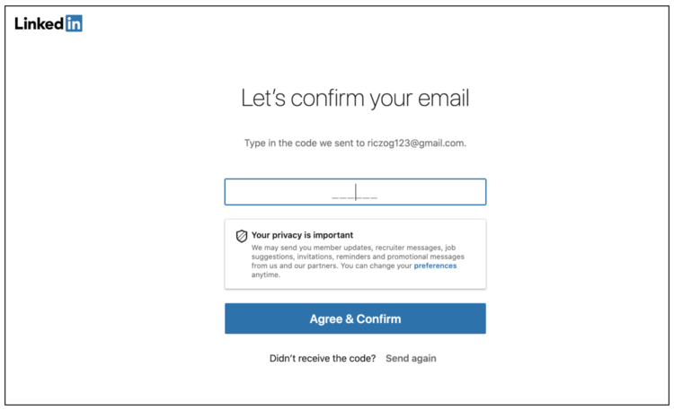 Enter the code that you got emailed from LinkedIn and click “Agree & Confirm”
